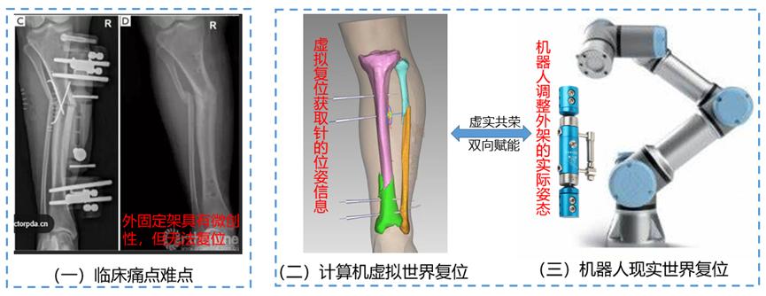 为了能让外固定具有准确复位功能,增加外固定的适用症,我们引入了现代机器人技术和虚拟仿真技术,协作机器人具有精度高与稳定性强的特点,具有强大的人机协同灵活性,能够提供准确的空间定位。而虚拟仿真技术可通过“数字化预演”以可逆、可重复的方式复刻骨折复位后的位姿关系。通过“虚实共荣”技术模式,在虚拟环境中精确测量畸形角度、位移,规划矫正目标。机器人根据规划精确调整外固定架,实现多平面、多维度的精准畸形矫正,实现外固定架的准确复位。其先进性主要表现在以下几个方面:1、在虚拟环境中进行精确的骨折复位规划和模拟,可以反复尝试、优化复位方案,确保复位路径和最终位置的最优化。这比传统依赖术中透视和医生经验的方法具有更高的可预测性和可控性;2、机器人系统能够根据虚拟规划的目标位置和实时获取的螺纹针位置信息,以亚毫米级的精度提前调整外固定架的连接杆或环,实现骨折块的精准对位和稳定固定;3、通过精准的闭合复位和机器人辅助的外固定架调整,可以显著降低需要切开复位的病例比例,减少手术创伤、出血量和感染风险。精准复位和稳定的外固定架固定,有助于骨折在最佳位置愈合,减少后期因复位不良而需要二次手术矫正(如截骨矫形)的可能性;4、形成“感知(螺纹针初始位置)-规划(虚拟目标位置)-执行(机器人调整)-验证(术中影像/虚实融合显示)”的闭环。医生可以基于实时反馈,让机器人进行微调,实现术中动态优化。