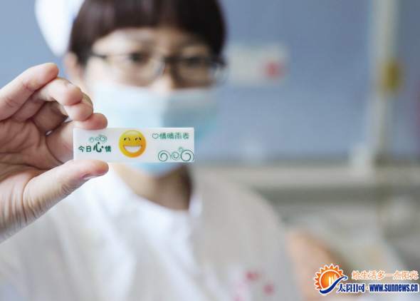 病人对医生多半比较敬畏,一般不敢直截了当对医院、医生表达情绪。为解决这一问题,护士们特别在每个病床床头摆放心情脸谱,开心或不开心,都由病人自主将小脸谱卡片插入插槽中。护士只要查房时发现病人床头上摆放着不开心的脸谱,就马上主动关心患者,询问病人的难处和忧虑。
