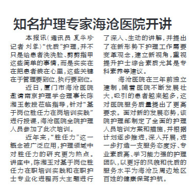 邀请南京护理学会理事长陈湘玉教授莅临指导,针对“基于岗位胜任力在岗培训实践”进行授课,海沧医院全院护理人员参加了此次培训。