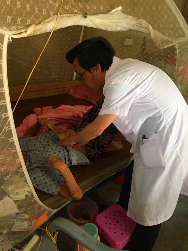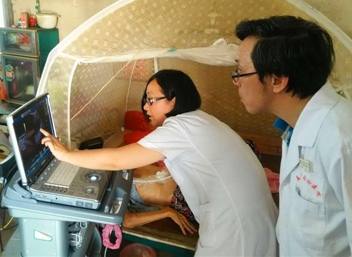 90岁高龄的刘老太 腹胀不适多日,但她不愿去医院就诊。得知情况后,医疗队派出几位专家前往离卫生所两三公里外的刘老太家中给她看病。普外科纪程宏主任为老太检查后认为需要 进行B超检查。因老人行动不便,专家们又回到凤山村卫生所,取床边B超后再到老人家中为其做检查。之后,几位专家现场会诊,给老人提出了一些实际可行的诊 疗方案。看到专家们为给自己母亲看病如此费周折,刘老太的儿子非常感动。