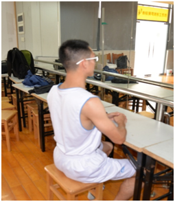 让青少年直腿弯腰至90度,检查者坐于受检者后方,双目平视观察受检者背部。从背部中线切线观察上胸段,胸段,胸腰段及腰段两侧是否等高、对称。