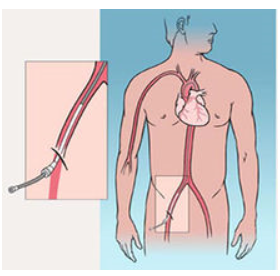 ![]() | → | 首先医生会经由您手腕的桡动脉/股动脉处穿刺插入一根细小导管,接着,沿动脉将导管送至冠脉病变处。 |