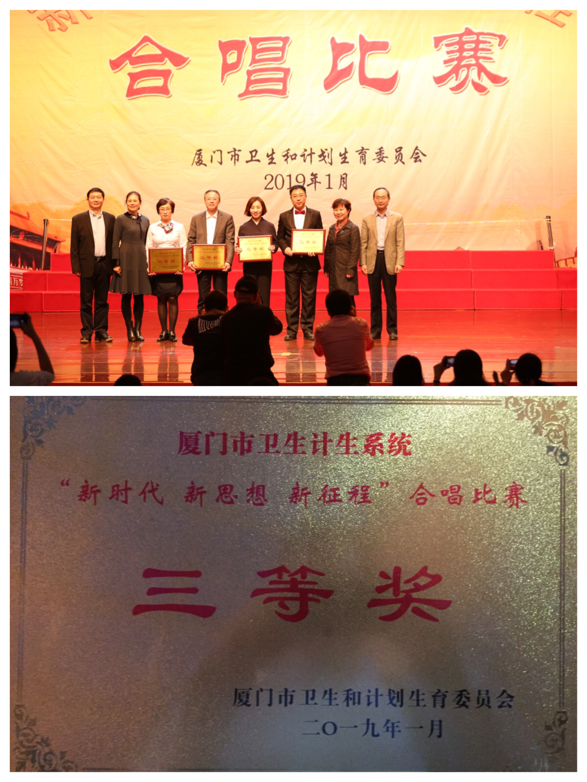 中文av 由陈长荣、姜燕、庄建民、游立、黄海望和陈毅德等6位院领导班子成员及其他人员组成的展望合唱队,在参加1月12日下午由厦门市卫生和计划生育委员会举办的“新时代 新思想 新征程”合唱比赛中,表现突出,以优异的成绩荣获本次比赛的三等奖。