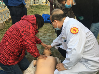 最后还在现场进行分步实操教学,让大家在人体模型上进行模拟练习,在实际操作中,经过医生们一次次纠正、讲解、示范后,大家能基本掌握主要要点,并得到医生的表扬。