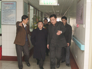 国家卫生部党组书记、副部长张茅,国家中医药管理局副局长吴刚,山东省人民政府副省长王随莲等领导观看国家中医临床研究基地综合楼工程沙盘