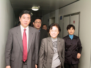 国家卫生部党组书记、副部长张茅,国家中医药管理局副局长吴刚,山东省人民政府副省长王随莲等领导观看国家中医临床研究基地综合楼工程沙盘