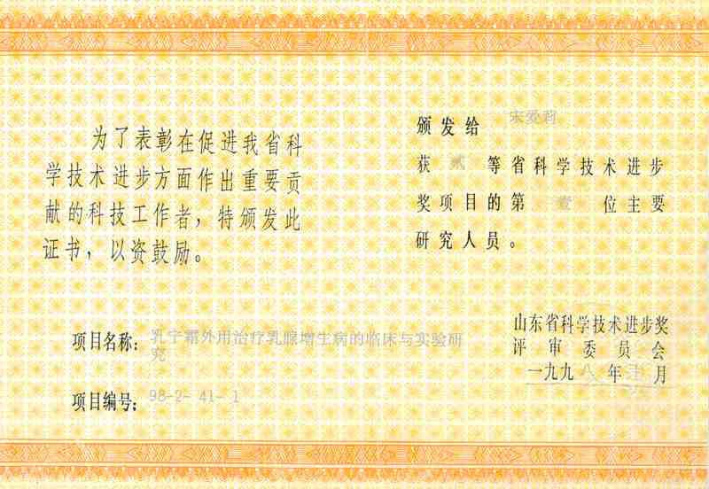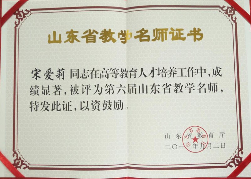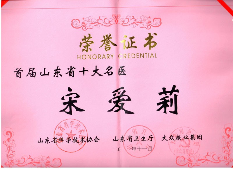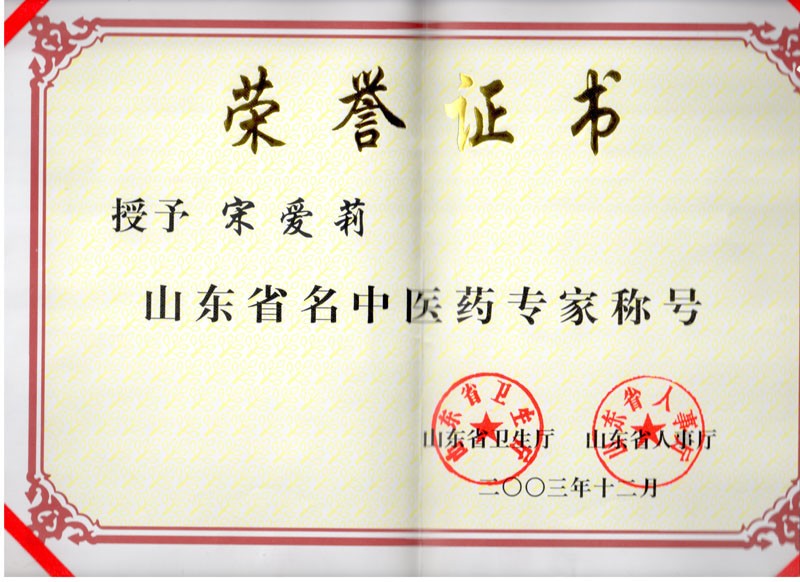 获奖资料1 2017.06.20 来源部门: 作者: 系统 1.山东省名中医药专家证书 2003.12 2.山东省十大名医荣誉证书 3.第六届山东省教学名师--证书 4.省科学技术进步二等奖证书1998.10 分享