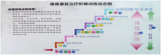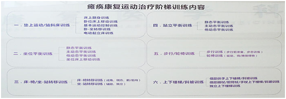 对瘫痪患者,由康复治疗小组讨论后,结合“瘫痪康复治疗阶梯训练动态图”及“ 瘫痪康复运动治疗阶梯训练内容”等反馈,调整治疗方案或决定终止康复治疗。对出院患者安排家庭训练指南作为康复治疗的延伸。