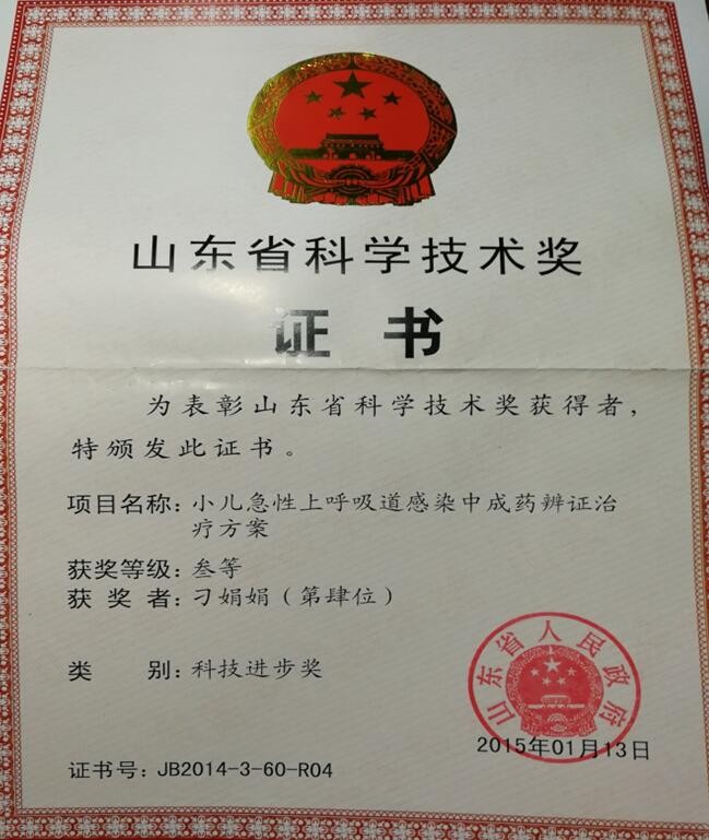 获省级科学技术进步奖三等级奖励1项;获山东中医药科技技术奖二等奖2项。