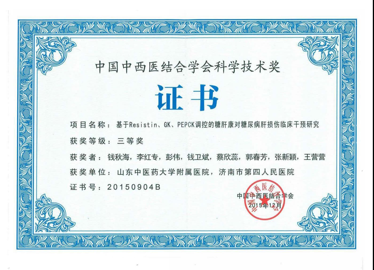 3、科研成果“基于Resistin、GK、PEPCK调控的糖肝康对糖尿病肝损伤临床干预研究”,2015年12月获中国中西医结合学会科学技术奖三等奖(第1位,20150904B);