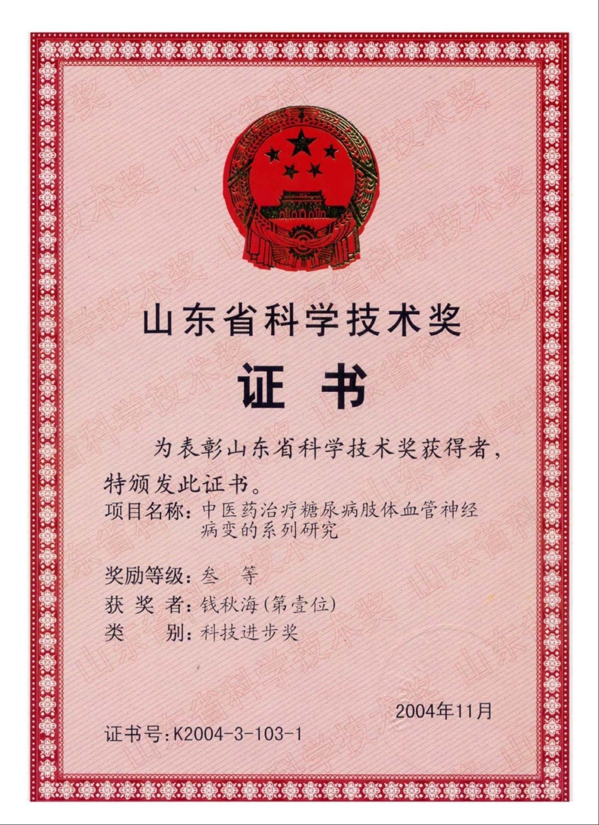 6、科研成果“中医药治疗糖尿病肢体血管神经病变的系列研究”,2004年11月获山东省科技进步奖三等奖(第1位,K2004-3-103-1);