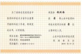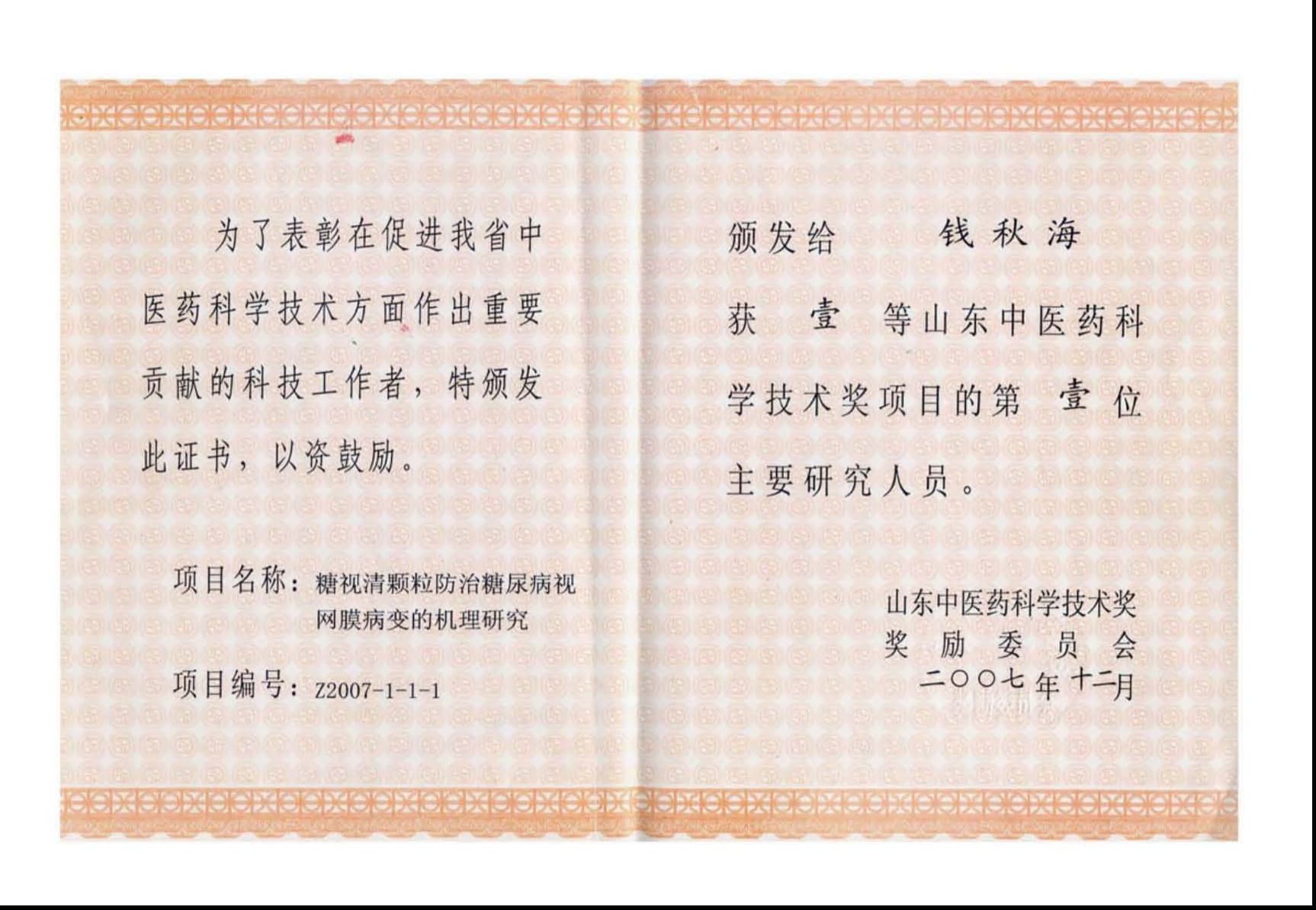 5、科研成果“糖视清颗粒防治糖尿病视网膜病变的机理研究”,2008年4月获山东省科技进步奖三等奖(第1位,JB2007-3-130-1),2007年12月获山东中医药科学技术奖一等奖(第1位,Z2007-1-1-1);