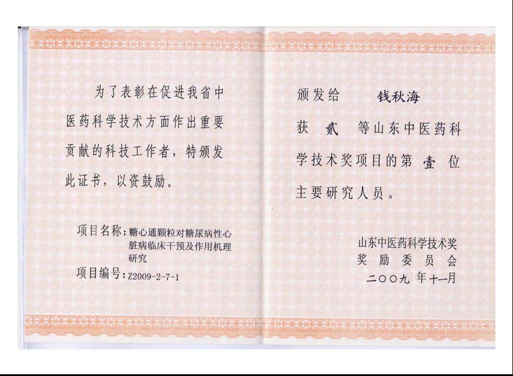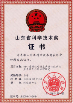 4、科研成果“糖心通颗粒对糖尿病性心脏病临床干预及作用机理研究”,2010年1月获山东省科技进步奖三等奖(第1位,JB2009-3-263-1),2009年11月获山东中医药科学技术奖二等奖(第1位,Z2009-2-7-1);
