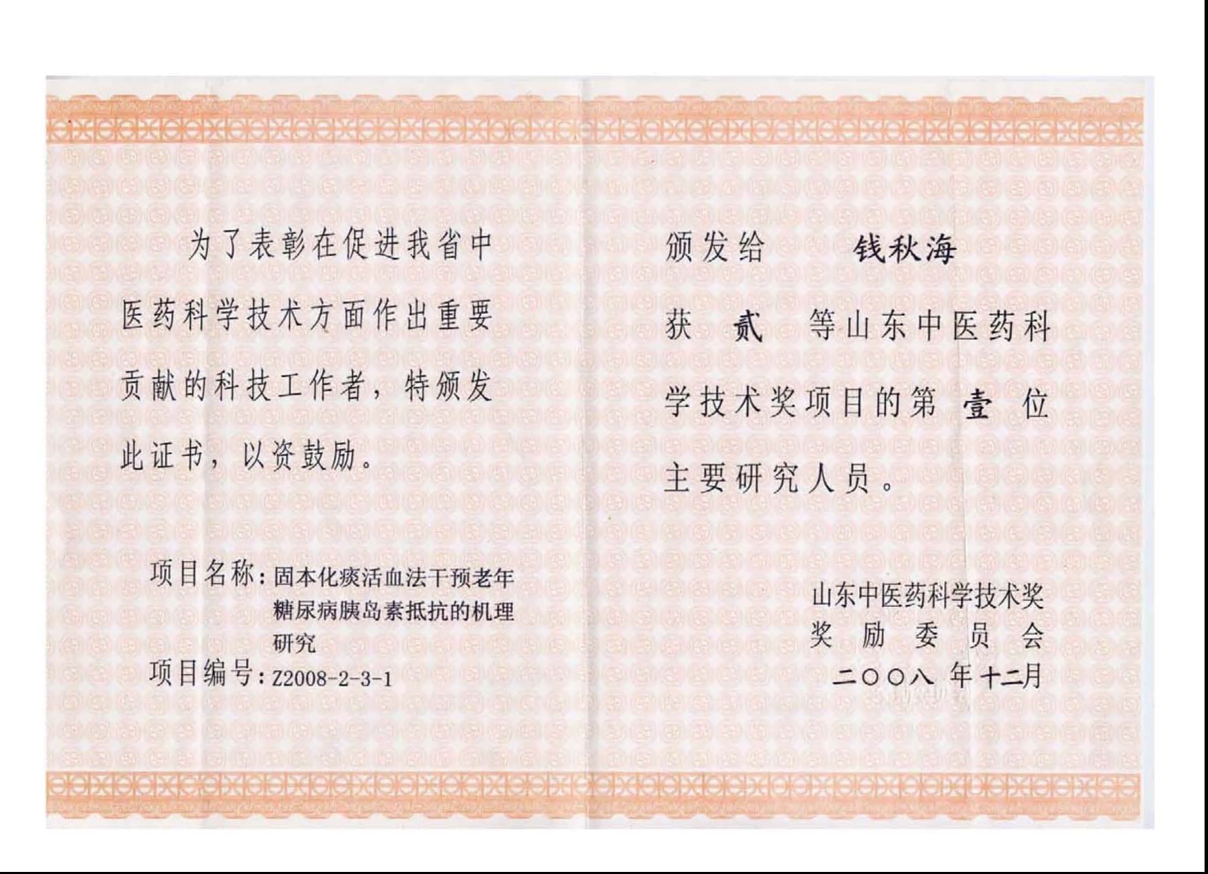 10、科研成果“固本化痰活血法干预老年糖尿病胰岛素抵抗的机理研究”,2008年12月获山东中医药科学技术奖二等奖(第1位,Z2008-2-3-1);