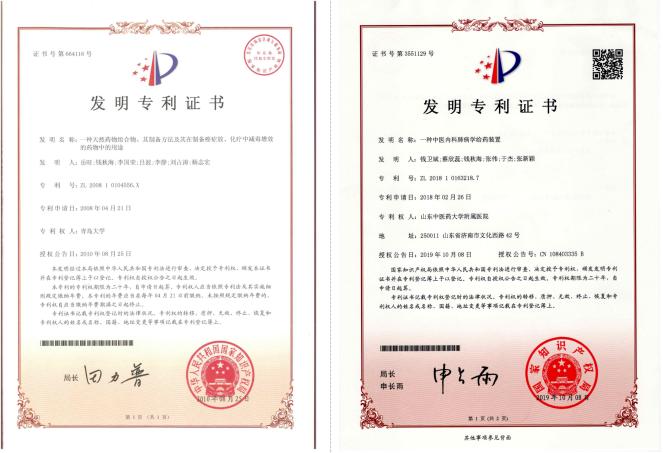1、国家技术专利“一种天然药物组合物、其制备方法及其在制备癌症放、化疗中减毒增效的药物中的用途”,2012年,中华人民共和国知识产权局,(第二位,国家技术发明专利,ZL 2008 10104556.X)。