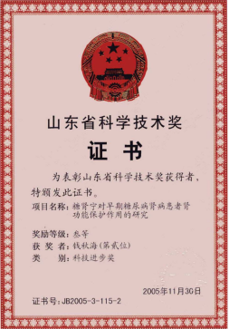 7、科研成果“糖肾宁对早期糖尿病肾病患者肾功能保护作用的研究”,2005年11月获山东省科技进步奖三等奖(第2位,JB2005-3-115-2);