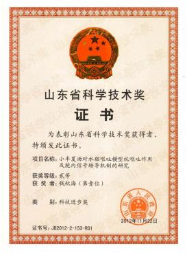 1、科研成果“小半夏汤对水貂呕吐模型抗呕吐作用及胞内信号转导机制研究”,2012年11月获山东省科技进步奖二等奖(第1位,JB2012-2-153-R01);