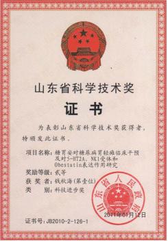2、科研成果“糖胃安对糖尿病胃轻瘫临床干预及对5-HT2A、NK1受体和Obestatin表达作用研究”,2011年1月获山东省科技进步奖二等奖(第1位,JB2010- 2-126-1);