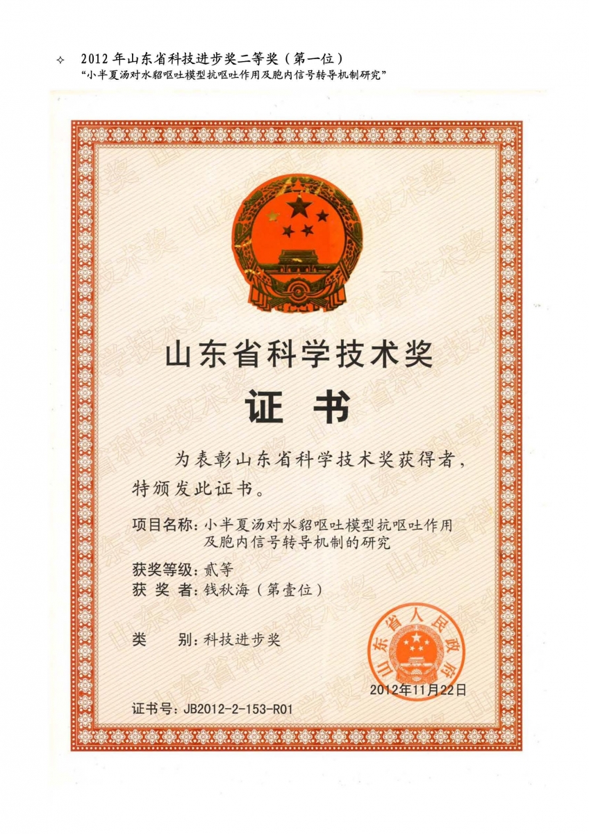 1、科研成果“小半夏汤对水貂呕吐模型抗呕吐作用及胞内信号转导机制研究”,2012年11月获山东省科技进步奖二等奖(第1位,JB2012-2-153-R01);