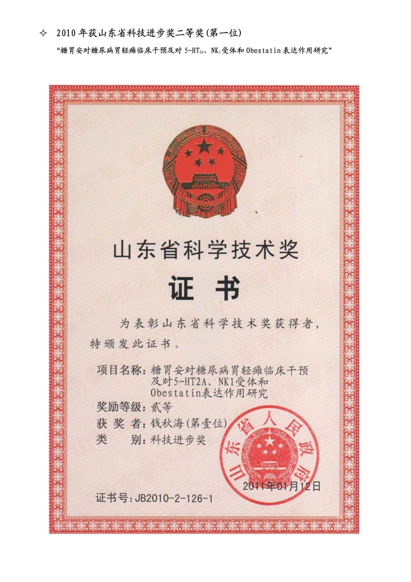2、科研成果“糖胃安对糖尿病胃轻瘫临床干预及对5-HT2A、NK1受体和Obestatin表达作用研究”,2011年1月获山东省科技进步奖二等奖(第1位,JB2010- 2-126-1);