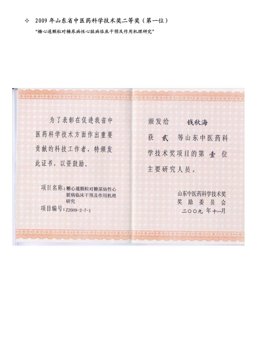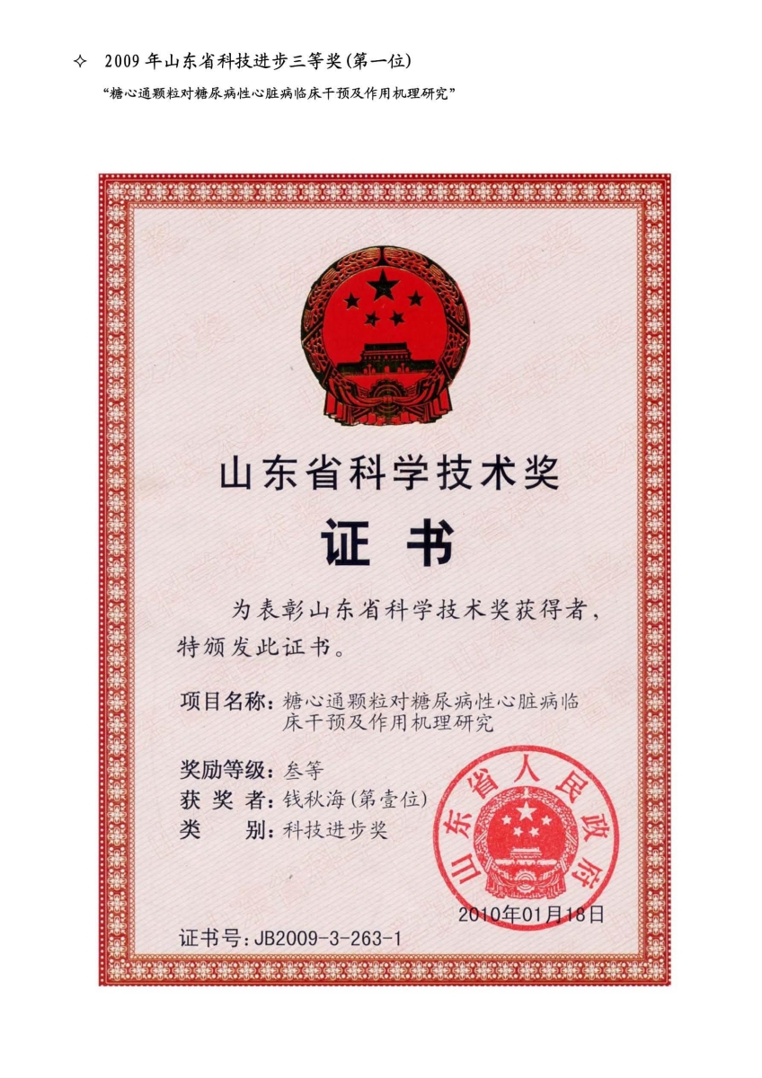 4、科研成果“糖心通颗粒对糖尿病性心脏病临床干预及作用机理研究”,2010年1月获山东省科技进步奖三等奖(第1位,JB2009-3-263-1),2009年11月获山东中医药科学技术奖二等奖(第1位,Z2009-2-7-1);