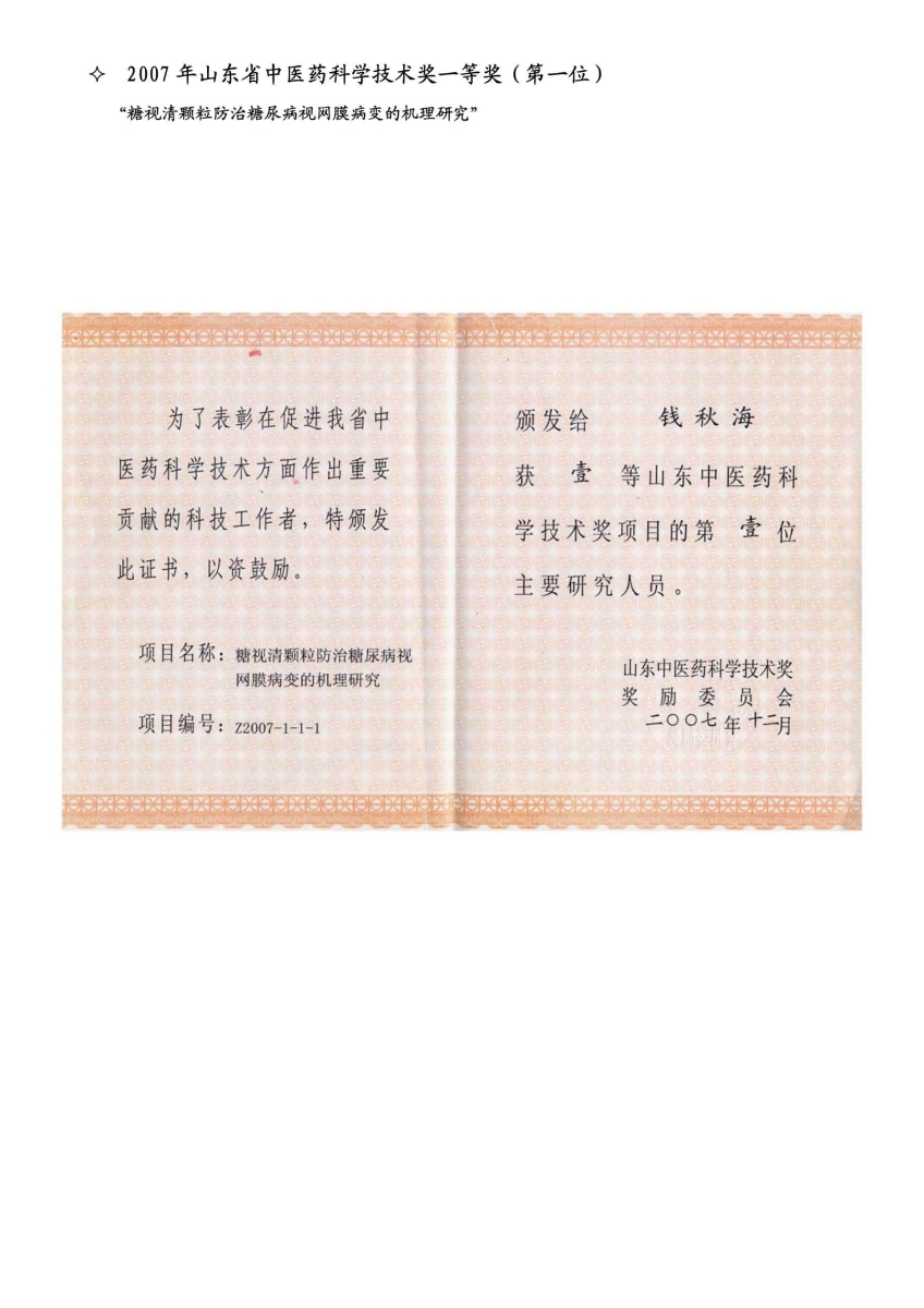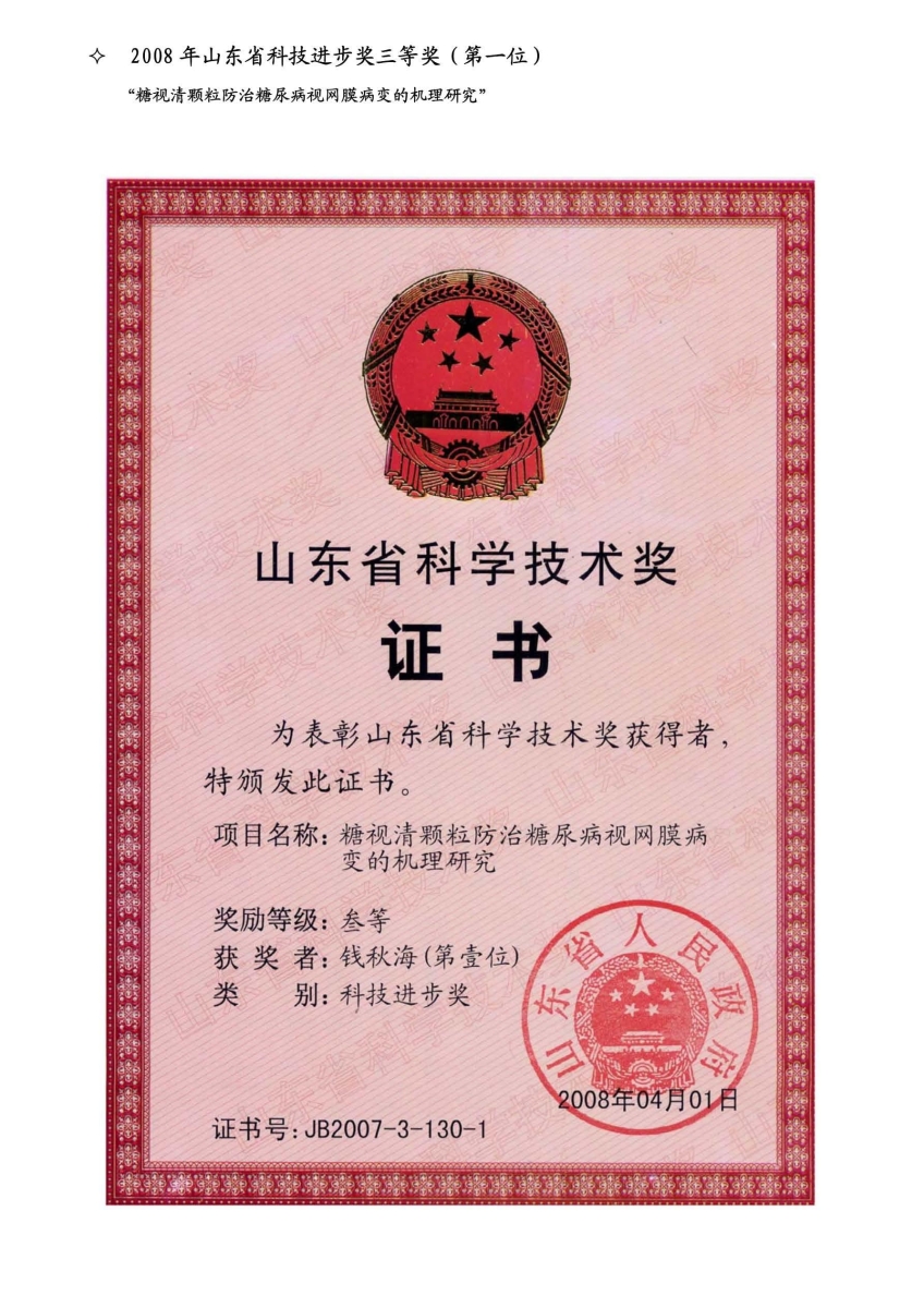 5、科研成果“糖视清颗粒防治糖尿病视网膜病变的机理研究”,2008年4月获山东省科技进步奖三等奖(第1位,JB2007-3-130-1),2007年12月获山东中医药科学技术奖一等奖(第1位,Z2007-1-1-1);