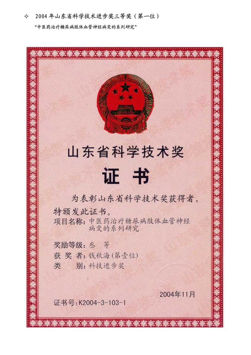 6、科研成果“中医药治疗糖尿病肢体血管神经病变的系列研究”,2004年11月获山东省科技进步奖三等奖(第1位,K2004-3-103-1);