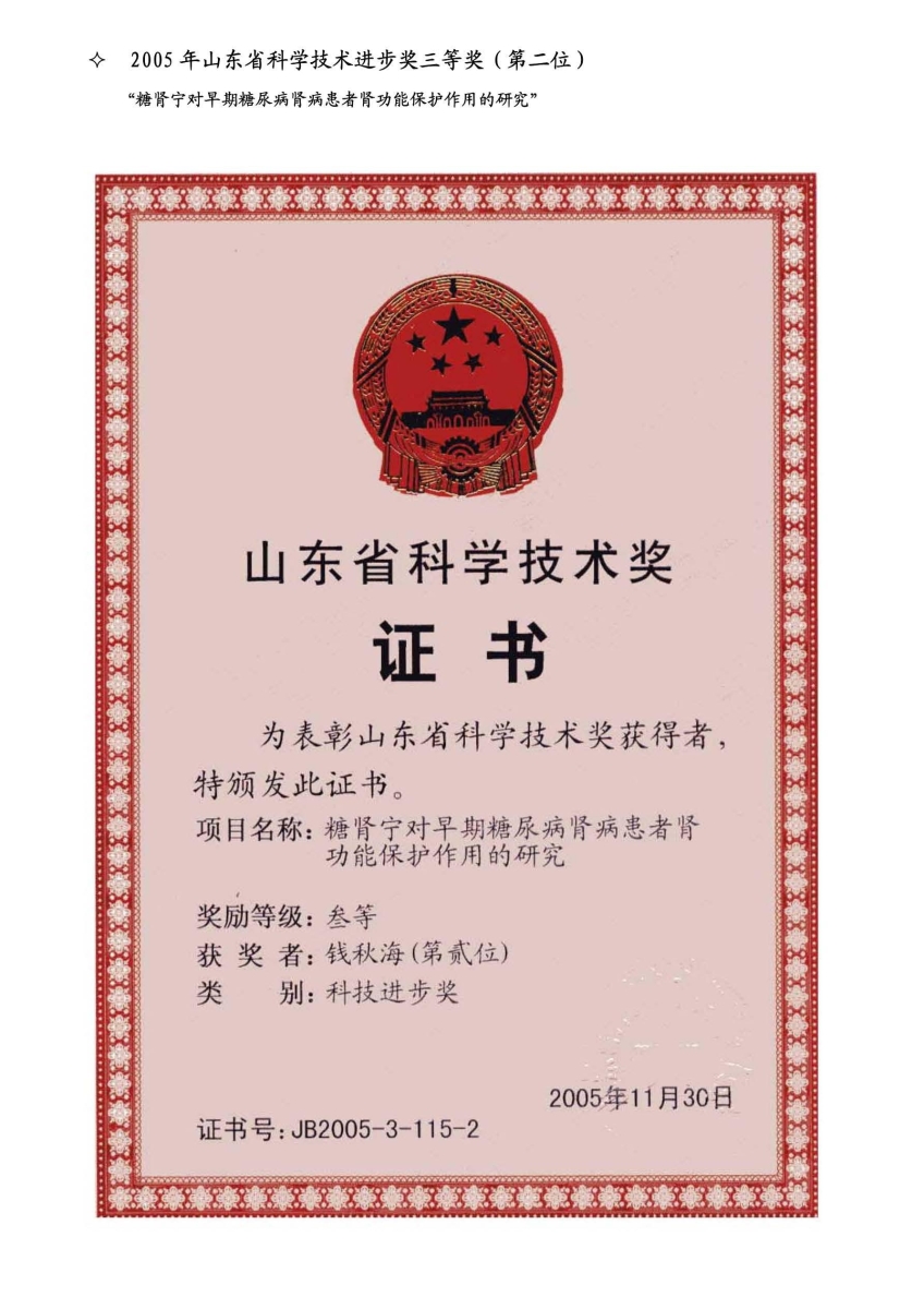 7、科研成果“糖肾宁对早期糖尿病肾病患者肾功能保护作用的研究”,2005年11月获山东省科技进步奖三等奖(第2位,JB2005-3-115-2);
