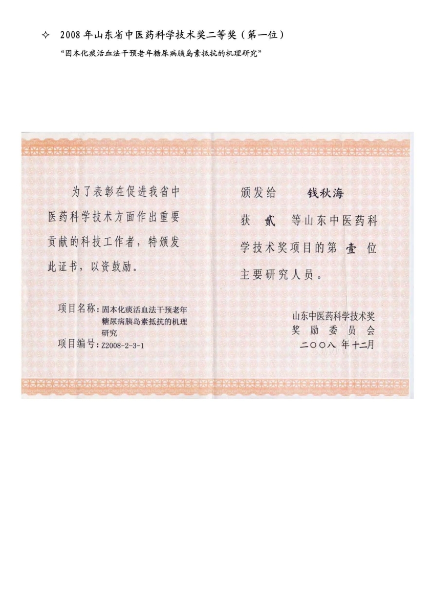 10、科研成果“固本化痰活血法干预老年糖尿病胰岛素抵抗的机理研究”,2008年12月获山东中医药科学技术奖二等奖(第1位,Z2008-2-3-1);