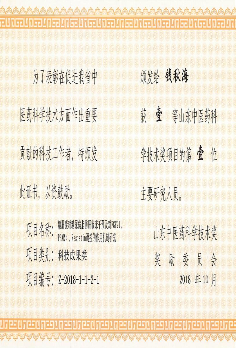 9、科研成果“糖肝康对糖尿病脂肪肝临床干预及对FGF21、PPARα、Resistin调控的作用机制研究”,2018年10月获得,山东中医药学会科学技术奖一等奖,(第1位,Z-2018-1-1-2-1);