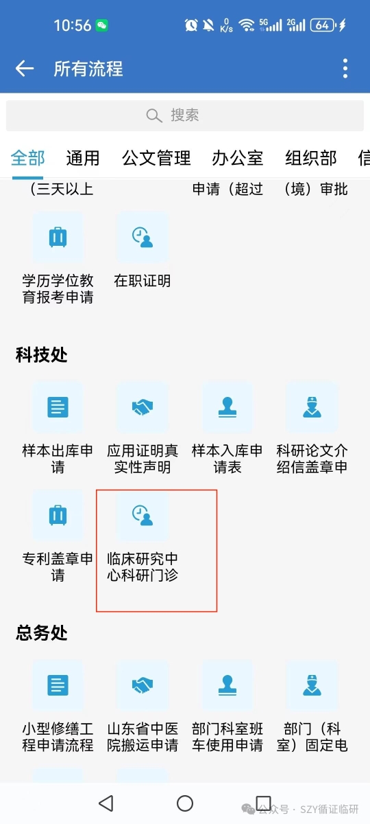 (2)第二步:下拉页面,找到科技处“临床研究中心科研门诊”
