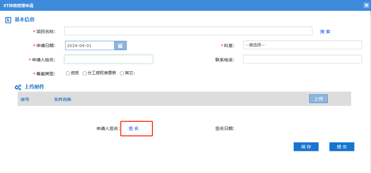 如有IIT资料(如CRC资质、分工授权表更新、或其他资料)需要在本中心备案,需提交临床科研一体化平台“临床研究IIT - IIT其他”,走IIT备案流程,点“申请人签名”;CRC管理请遵照临床研究CRC管理制度,具体参考附件7:CRC管理标准操作规程。