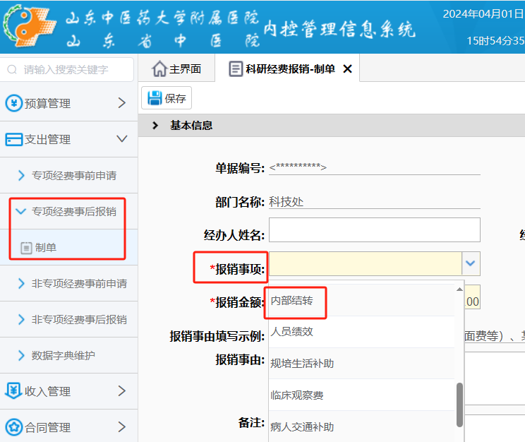 PI在内控管理信息系统的课题资金到账分解时,把立项审查费金额类目设为“其他”,临床研究中心在内控管理系统发起扣款流程。