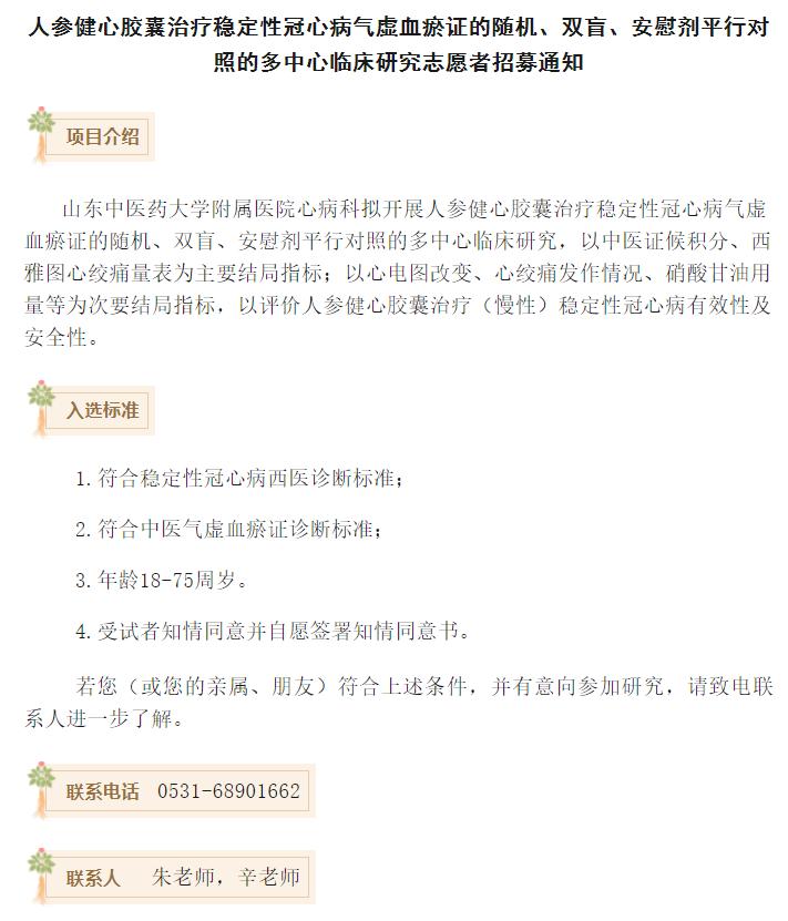 【招募广告】招募稳定性冠心病气虚血瘀证患者
