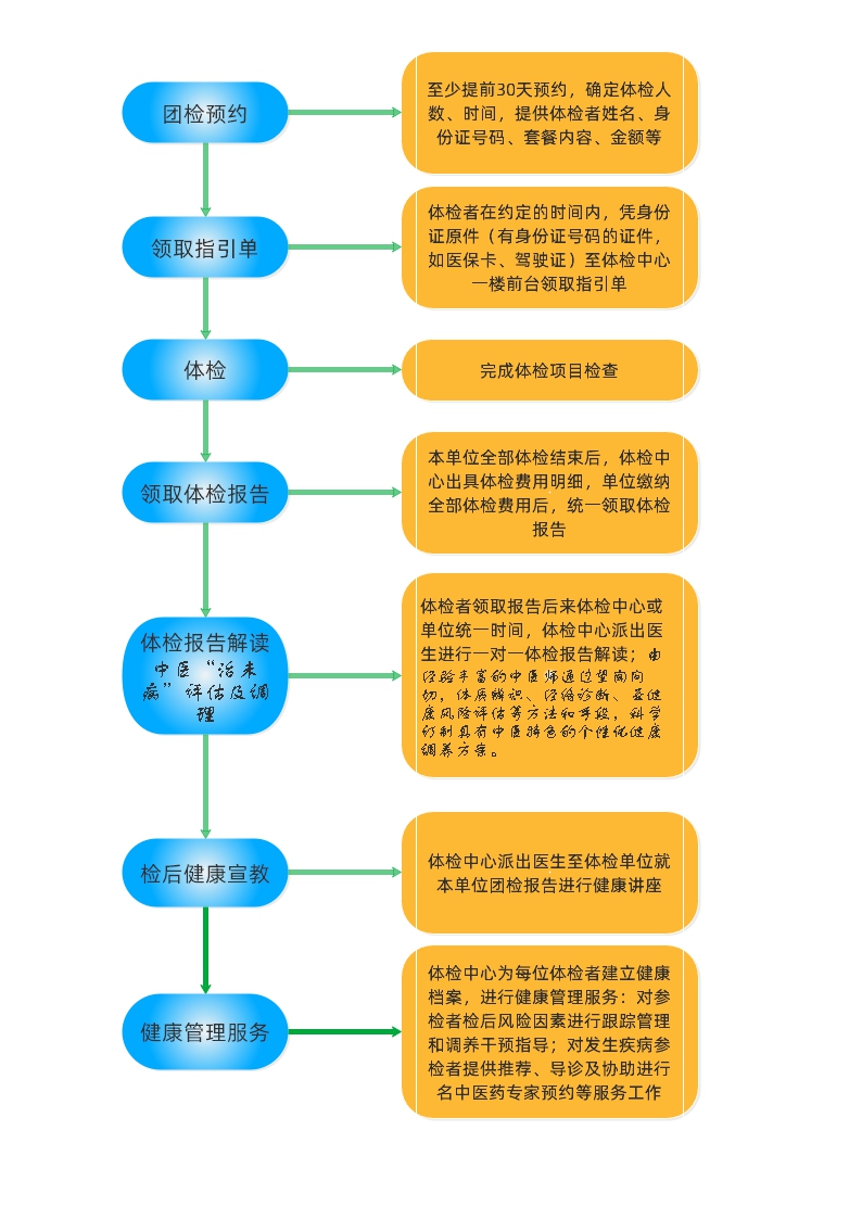 中文av 健康管理中心团体体检流程 2019.06.19 来源部门:查体中心 ㈠总体流程 单位相关部门与健康管理中心联系,签订体检协议书,根据单位人数,安排相应的天数,每天可安排体检约100人,联系电话:0531-68617166。 ㈡具体体检流程 分享